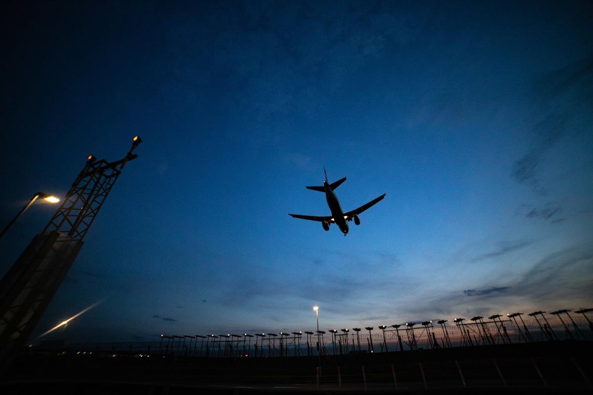 [ad_1] Airplane silhouettes while on final approach landing, during the sunset, dusk and magic hour at the British capital, London Heathrow International Airport EGLL LHR in England, United Kingdom UK. The Boeing and Airbus aircraft are landing on the northern runway over the antennas of the radio navigation instruments. (Photo by Nicolas Economou/NurPhoto via Getty...Read More