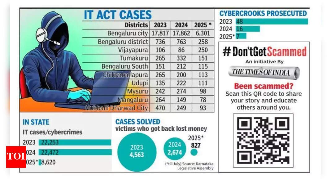 [ad_1] Mysuru: Cybercrooks continue to swindle money from bank customers in Karnataka and are now targeting customers in tier-II and III cities.According to the data shared by home minister G Parameshwara, while replying to a query about Karnataka during the ongoing assembly session, in the first seven months of 2025, about 8,620 cases were reported....Read More