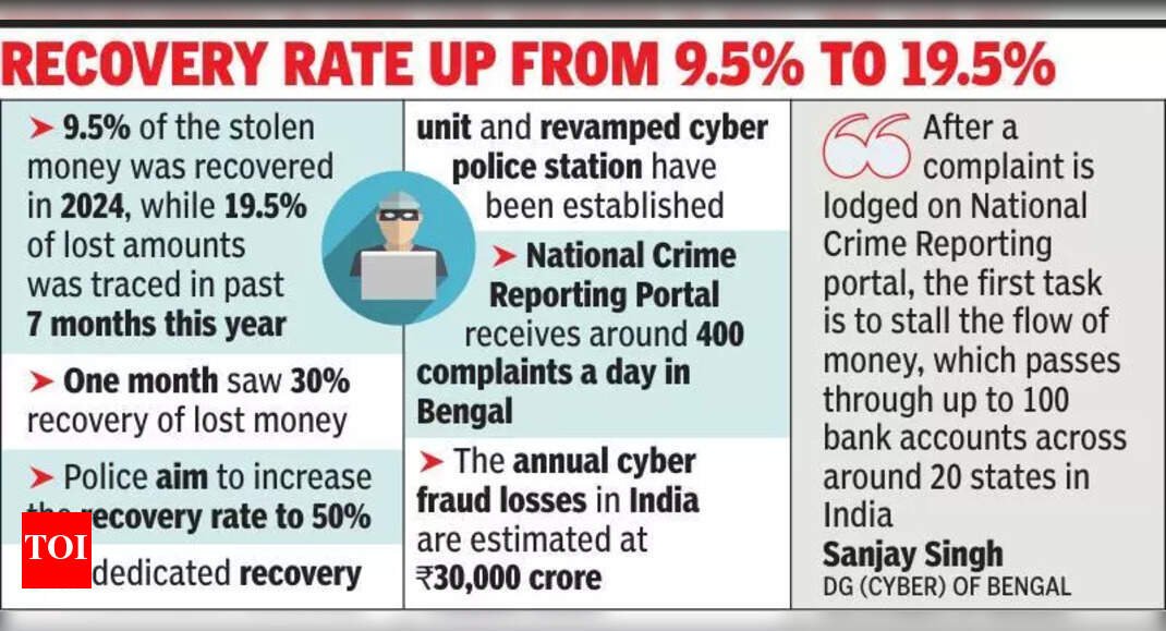 [ad_1] Kolkata: The amount of money lost to cybercrime in the city has decreased, from an average of Rs 22 crore a month in 2024 to around Rs 16.5 crore a month now. Recovery of siphoned money had also increased though the rate needed to improve further, said a senior Lalbazar officer. Police and cybercrime...Read More