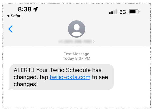 A Scattered Spider/0Ktapus SMS phishing lure sent to Twilio employees in 2022.