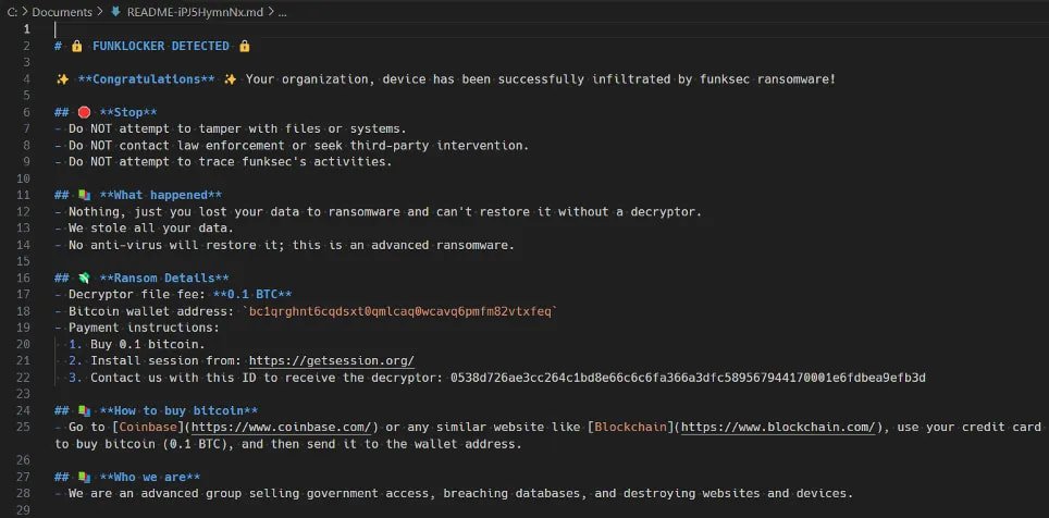 FunkSec encrypted files in 128-byte blocks, each appended with 48 bytes of metadata, resulting in encrypted files being approximately 37% larger than their originals. Affected files bear the “.funksec” extension and are accompanied by a ransom note titled README-{random}.md in each affected folder. During execution, the malware searches all available local drives and excludes a large number of file types from encryption, primarily documents, multimedia, and software-related extensions.