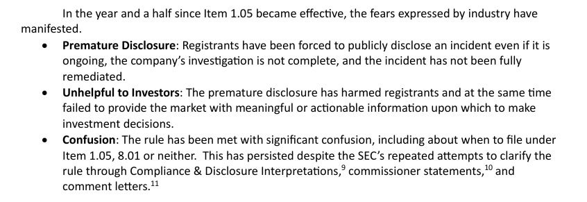 “Critically, without Item 1.05, investor interests will still be protected, and we believe they would be better served through the pre-existing disclosure framework for reporting material information, which may include material cybersecurity incidents,” the groups stated.