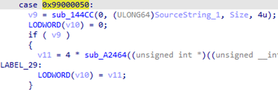 The following piece of code in the driver handles the IO control code 0x99000050 mentioned above: