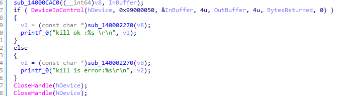 Next, the tool communicates with the installed service via IO control code 0x99000050, which is responsible for killing processes. The tool also has more capabilities, like deleting files and uninstalling drivers, and these use different IO control codes (0x990000D0 and 0x990001D0).