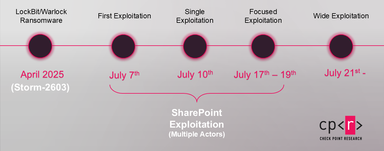 Check Point Research (CPR) has been closely monitoring the ongoing exploitation of a group of Microsoft SharePoint Server vulnerabilities collectively referred to as “ToolShell.” These active attacks leverage four vulnerabilities—CVE-2025-49704, CVE-2025-49706, CVE-2025-53770, and CVE-2025-53771—and are attributed to multiple China affiliated threat actors.