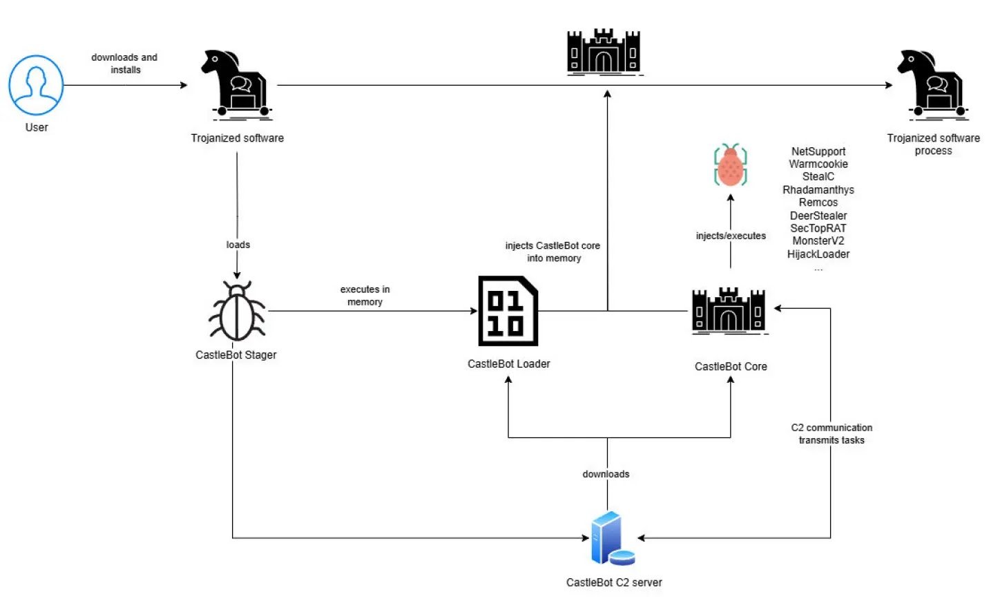 What makes CastleBot particularly concerning is its three-stage architecture consisting of a stager/downloader, a loader, and a core backdoor component.