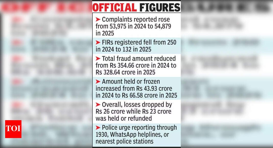 Jaipur: Cybercrime-related losses in Rajasthan dropped by Rs 26 crore in the first six months of this year compared to the same period last year, while Rs 23 crore was held or refunded, police officials said Saturday. Data from the National Cyber Crime Reporting Portal showed complaints rose slightly from 53,975 in the first half of 2024 to 54,879 in 2025, but FIRs dropped from 250 to 132. The total reported fraud amount went down from Rs 354.66 crore to Rs 328.64 crore, while the amount held or frozen increased from Rs 43.93 crore to Rs 66.58 crore.The decline followed special operations and widespread awareness drives. The launch of the cyber helpline 1930 and WhatsApp helplines 9256001930 and 9257510100, along with regular advisories in print and electronic media, led to more prompt reporting and quicker intervention, officials said. Police have urged people to call the helpline 1930, use the WhatsApp numbers, file a complaint on the cybercrime portal, or reach out to the nearest police station or cyber police station if they face any online fraud.