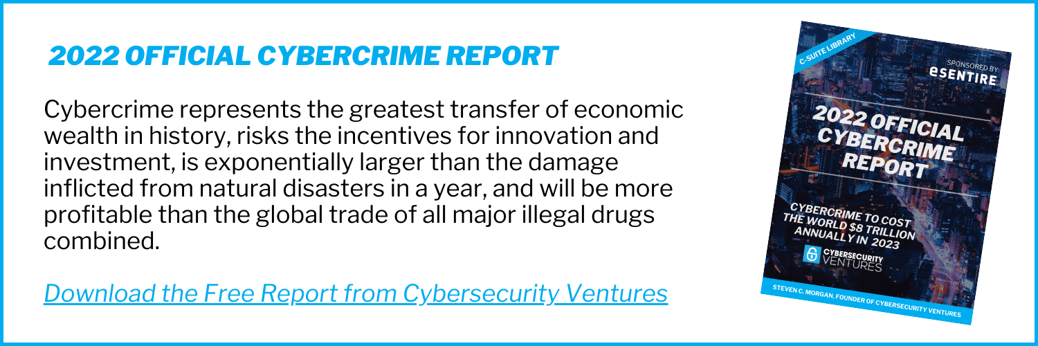 The 2022 Official Cybercrime Report published by Cybersecurity Ventures and sponsored by eSentire, provides cyber economic facts, figures, predictions and statistics which convey the magnitude of the cyber threat we are up against, and market data to help understand what can be done about it.