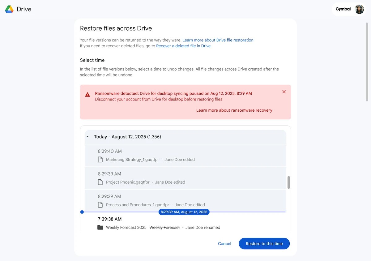 If ransomware encrypts files on a user’s computer, previous unencrypted versions can be restored from Google Drive. Users are informed when the suspicious activity started and receive guidance on how to recover their files.