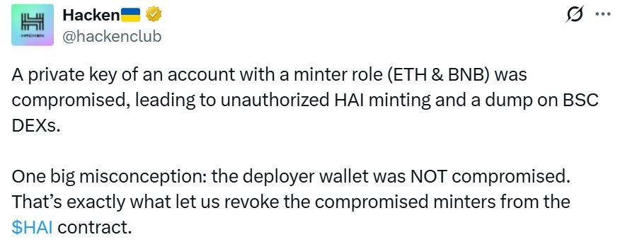 In an X post, Hacken said the private key was connected to an account with a minting role on the Ethereum and BNB Chain, which led to the “unauthorized HAI minting and a dump” on decentralized exchanges — causing a 99% drop in the value of HAI from $0.015 to $0.000056.