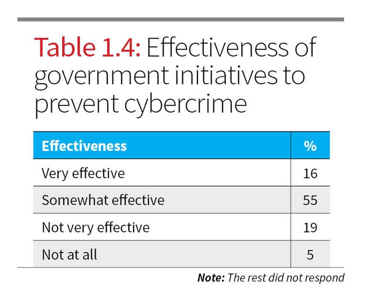 While government-led awareness campaigns, particularly mass messages and calls, were relatively well recognised (72% awareness as per Table 1.3), awareness of more concrete initiatives like the Cyber Swachhta Kendra was low (19%). When asked about the government’s effectiveness in combating cybercrime (Table 1.4), only 16% of people rated it as “very effective”.