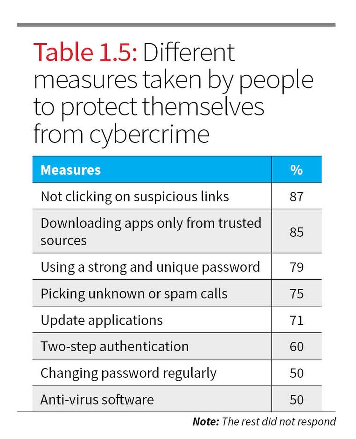 People in Delhi are adopting preventive measures. According to Table 1.5, the majority avoid suspicious links (87%), download apps only from trusted sources (85%), and around 79% use strong passwords.