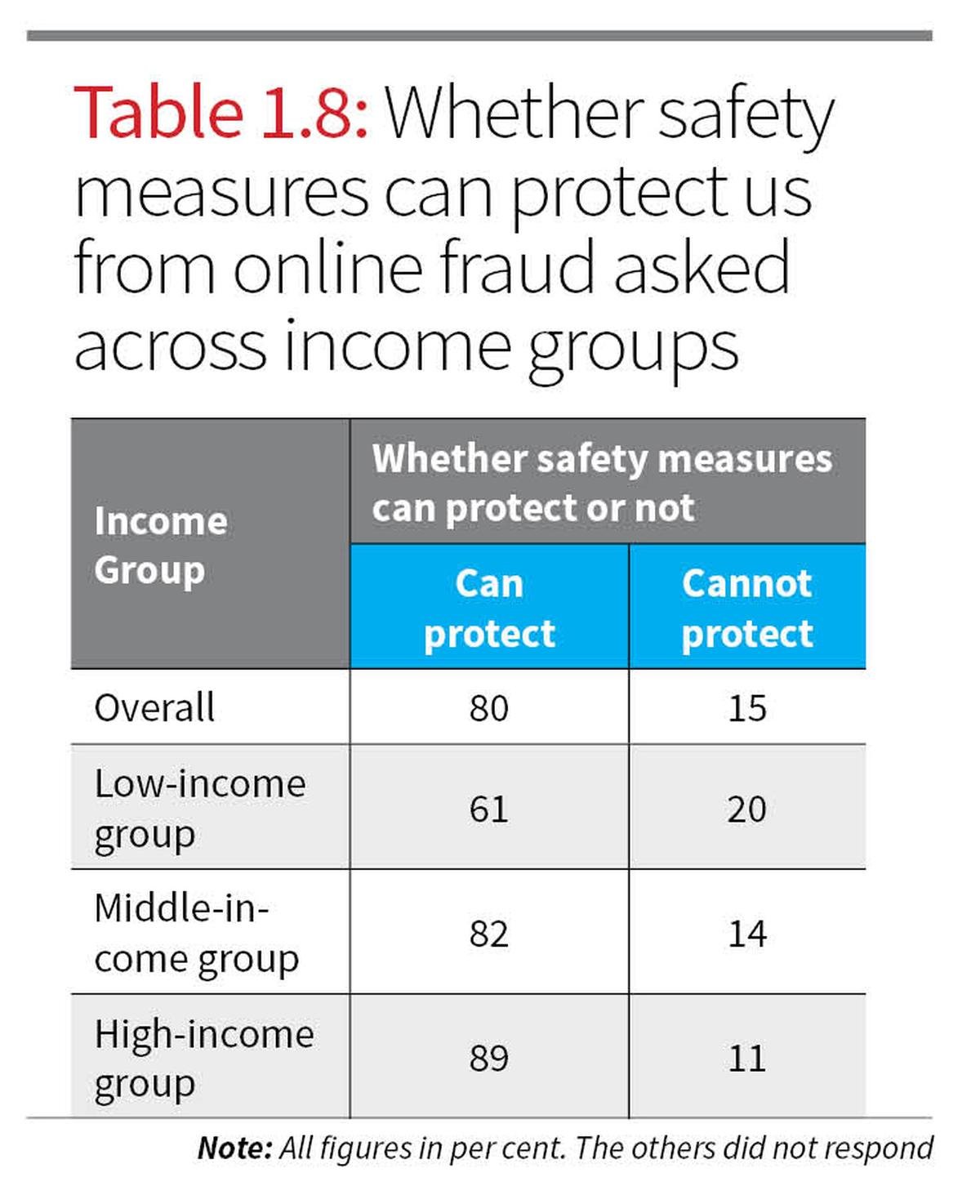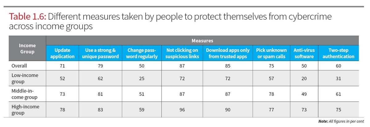 High-income respondents are far more likely to adopt comprehensive security measures, including antivirus software (73%) and two-step authentication (75%), compared to just 20% and 31% in low-income groups respectively. This disparity highlights the intersecting role of digital literacy, affordability, and access to cyber safety. Belief in the effectiveness of these precautions is strong, with 80% believing that these precautions protect them either “to a great extent” or “some extent” (Table 1.7).