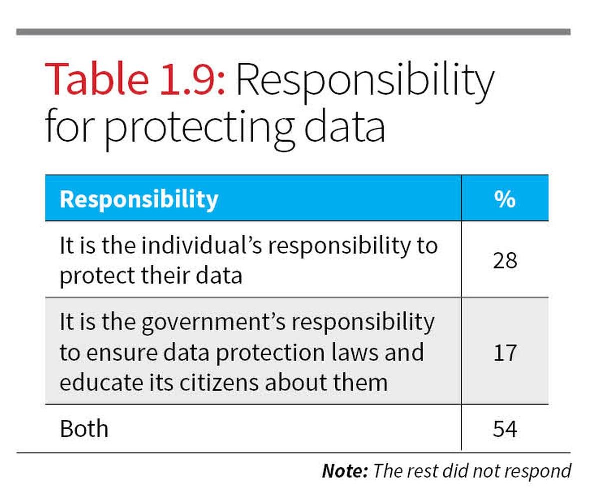 While 89% of high-income respondents trust their protective measures, only 61% of low-income participants share that belief in comparison. This perceived vulnerability may contribute to higher stress levels and avoidance behaviour among vulnerable groups. When asked about responsibility for data protection, more than half of the respondents (54%) said it should be a joint effort between individuals and the government (Table 1.9).