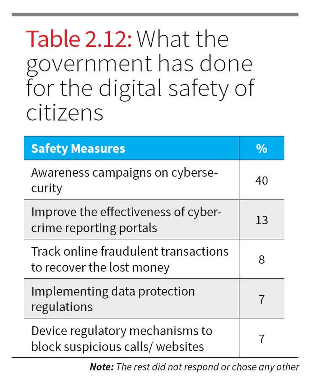 Finally, when asked about the most important government action to improve digital safety, 40% of respondents emphasised awareness campaigns, significantly outweighing support for technical fixes (Table 2.12), indicating preference for preventive education over reactive measures.