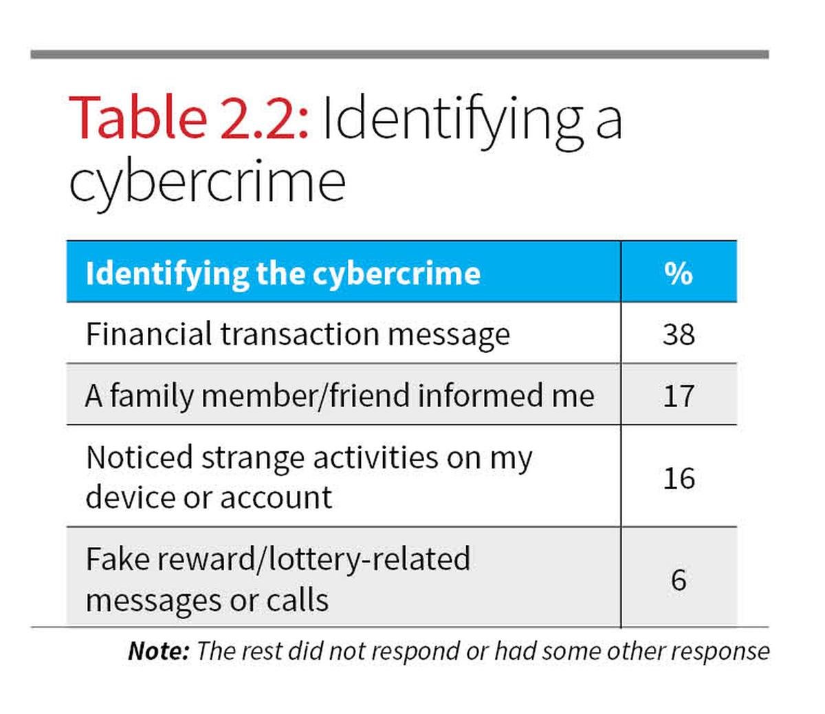 In Table 2.2, 38% reported recognising the fraud upon receiving a financial transaction message. Others were alerted by family or friends (17%) or by noticing irregularities on their account or device (16%). Very few identified the issue due to device malfunction, indicating that non-technical signs were more influential in realising that a cybercrime had occurred.