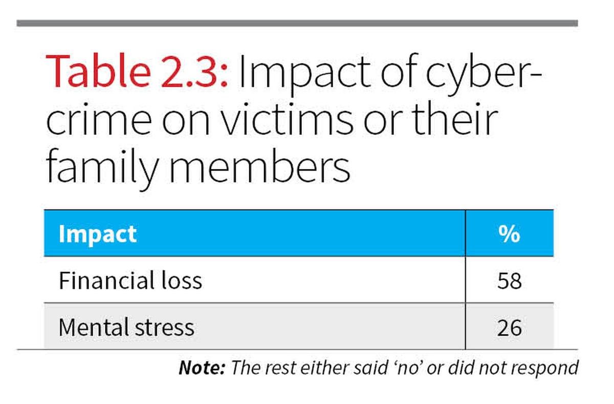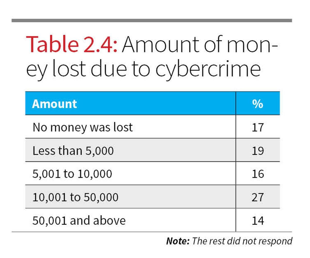 As indicated in Table 2.3, 58% of affected respondents reported financial loss, while 26% experienced mental stress. This suggests that while the economic impact is prominent, the psychological burden is also substantial and requires attention in policy discussions. In terms of the quantum of financial loss, Table 2.4 reveals that 27% of victims lost between ₹10,001 and ₹50,000, while 19% lost amounts less than ₹5,000. 14% of respondents reported that they had lost over ₹50,000 owing to cybercrime.
