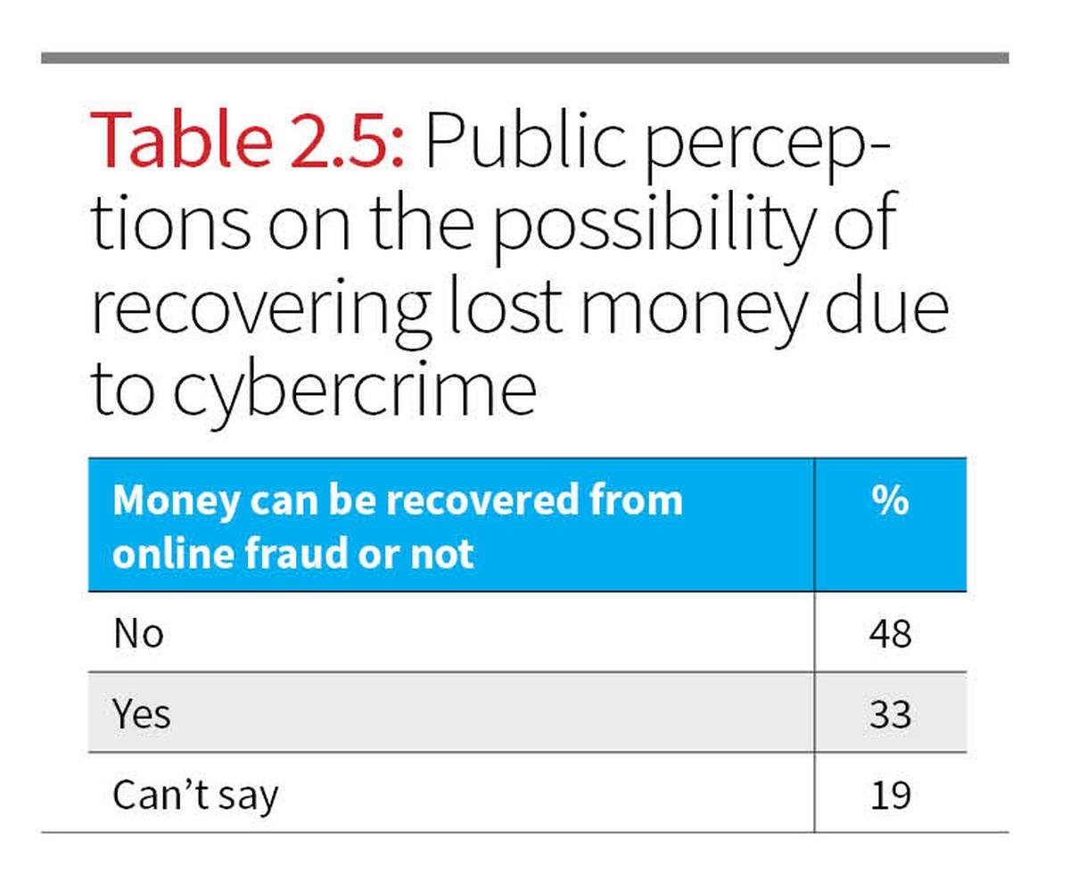 One of the most concerning findings relates to the perceived and actual inefficacy of recovery mechanisms. According to Table 2.5, 48% of respondents believed that money lost to cyber fraud could not be recovered.
