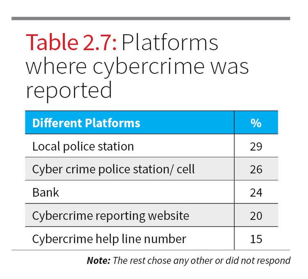 The survey findings indicate a serious gap between the experience of cybercrime and the response received from authorities, marked by high levels of under-reporting and widespread dissatisfaction. Only 21% of respondents who experienced cybercrime reported it, while 76% refrained from taking formal action, pointing to either a lack of awareness or deep mistrust in institutional mechanisms. Among those who did report, traditional platforms were more commonly used, 29% approached local police stations, 26% contacted cybercrime police cells, and 24% reported it to banks, whereas digital platforms like the cybercrime reporting website (20%) and helplines (15%) were less frequently used (Table 2.7), indicating the need for more credible and accessible online systems.
