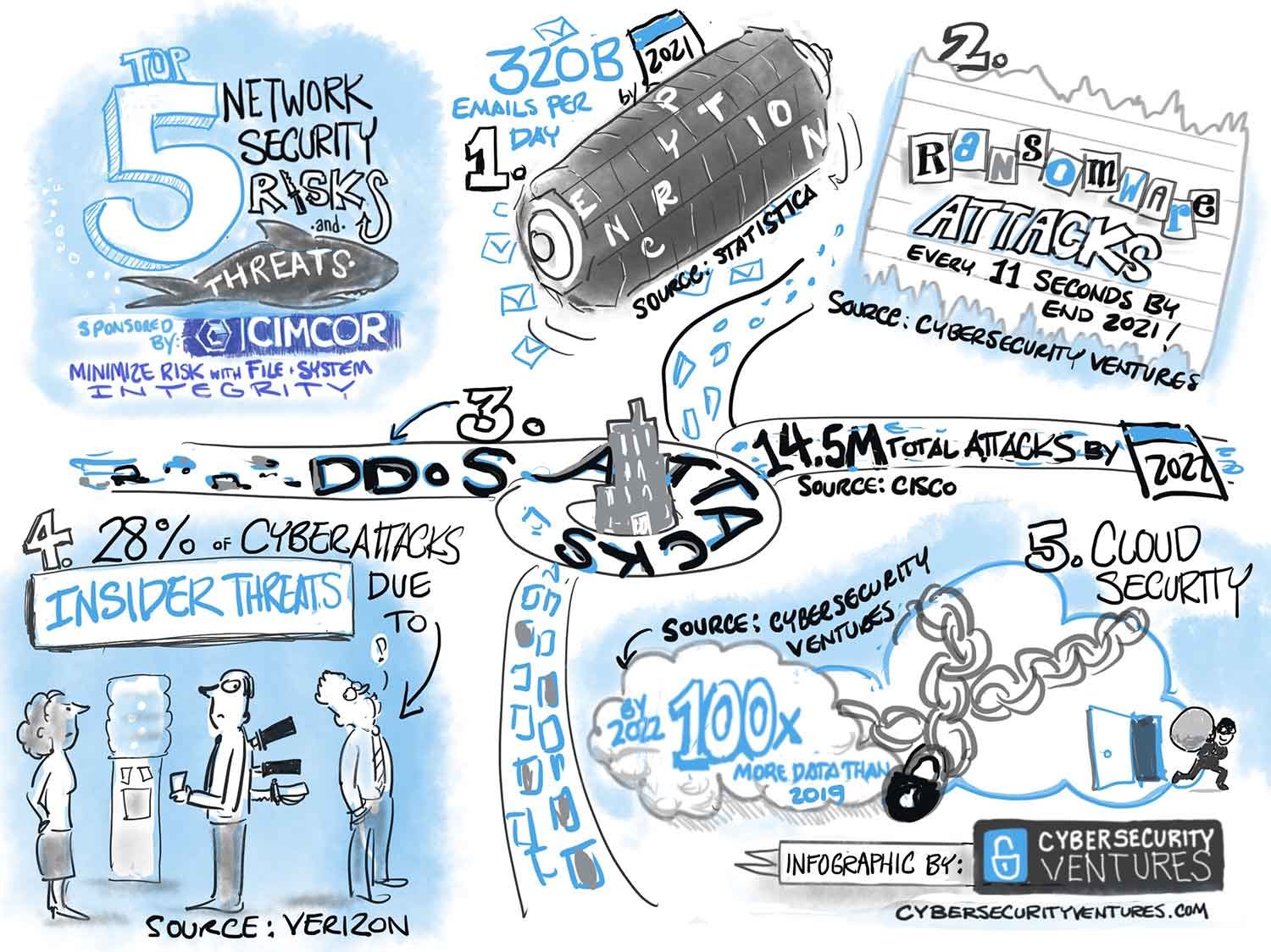 What are the top 5 network security risks and threats? Cimcor, Inc., developers of CimTrak for IT integrity, security, and compliance, says the top 5 are encryption, ransomware, DDoS (distributed-denial-of-service) attacks, insider threats, and the cloud — as you can see in this infographic.