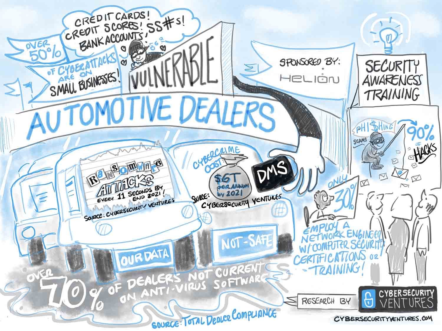 Small businesses, which include auto dealers, are the victims of more than 50 percent of all cyberattacks. Auto dealers collect personally identifiable information (PII) – including credit cards, credit scores, bank accounts, and SSN#s – from their customers, which makes them especially vulnerable to cyber intrusions. This infographic, sponsored by Helion, illustrates the risk.