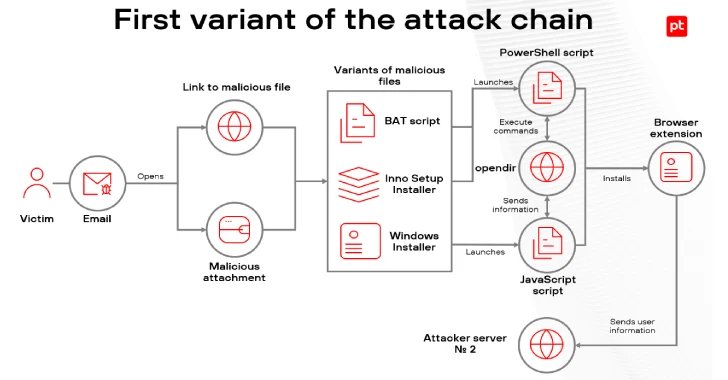 The attack starts with phishing emails disguised as invoices that trigger a multi-stage process to deploy the browser extension. The messages encourage recipients to download a file from an embedded link or open a malicious attachment contained within an archive.