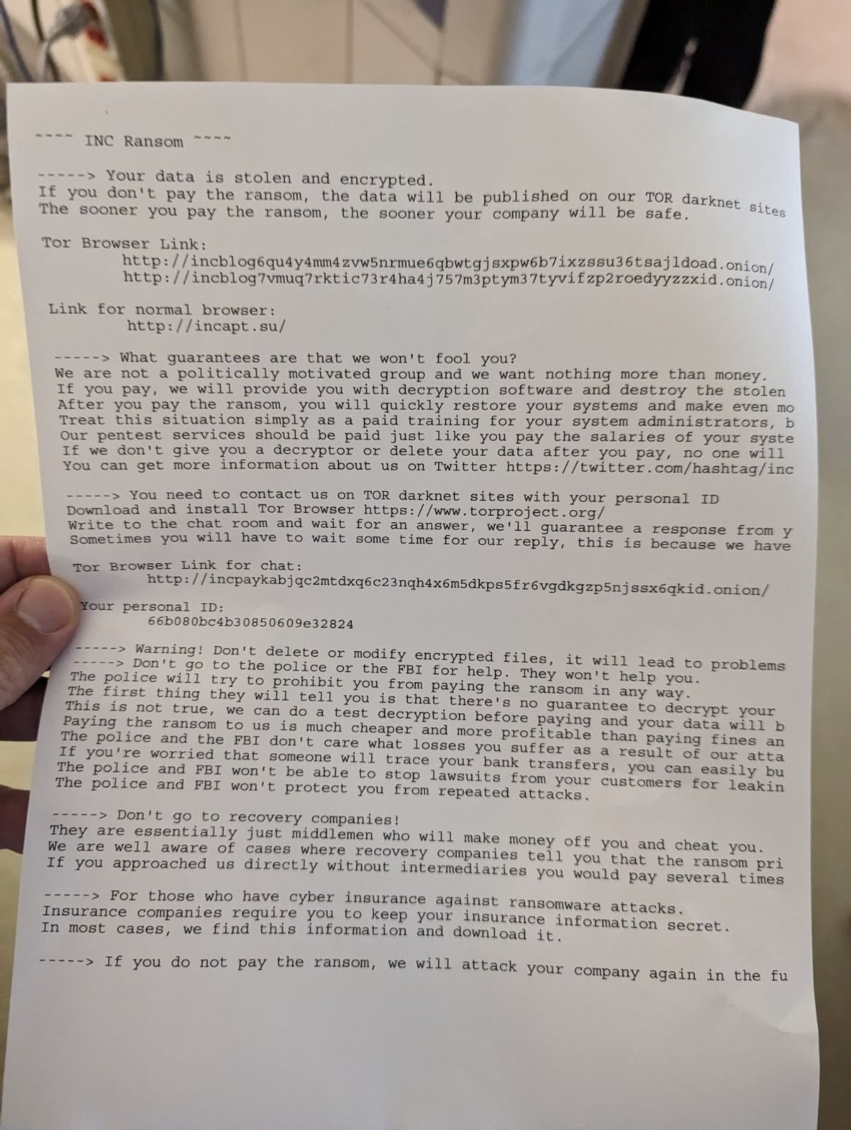 The notification letter never clearly acknowledges that this was a ransomware attack by INC Ransom that involved encryption, but a copy of the ransom note received by Karmanos was posted on X.com on August 5, 2024, the same day McLaren reports that they became aware of the attack.