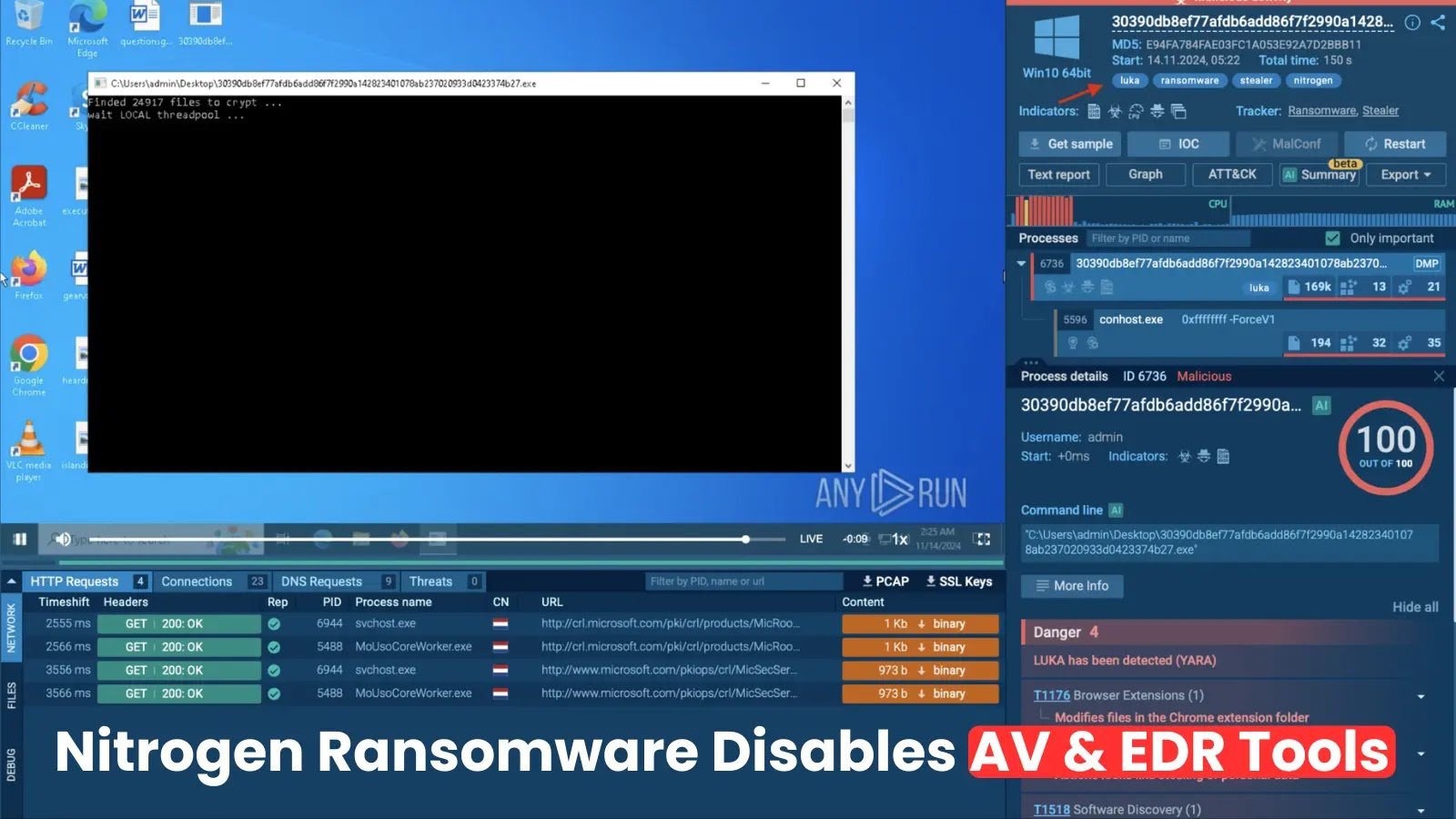 According to ANY.RUN report, the ransomware creates a unique mutex identified as “nvxkjcv7yxctvgsdfjhv6esdvsx” to ensure only one instance runs at a time. After infection, Nitrogen encrypts files and appends them with the “.NBA” extension.