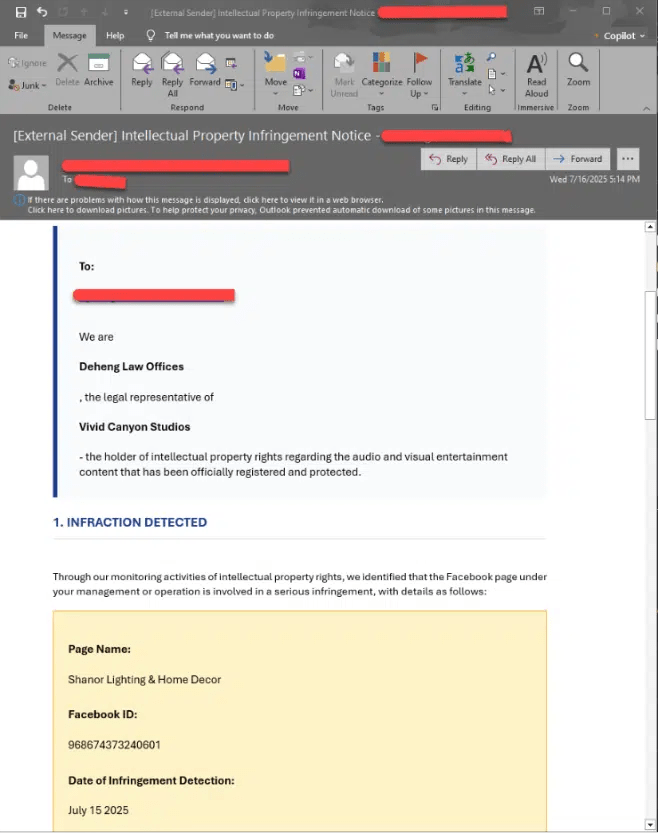 “These emails, often originating from Gmail accounts to evade suspicion, include precise details such as Page IDs and ownership information, indicating extensive reconnaissance. The urgent tone and legal threats pressure recipients-typically employees or generic contact and marketing inboxes like info@ or support@-to click malicious links disguised as evidence files (e.g., “View Copyright Infringement Evidence.pdf”).”