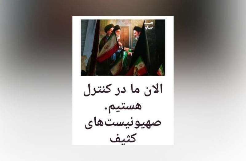The website featured for a while the words “Now we are under their control. The Zionists are handcuffed” in Farsi, as well as an image of Ruhollah Khomeini and Ayatollah Ali Khamenei looking on at Mojtaba Khamenei (son of Ali Khamenei), surrounded by regime paraphernalia.