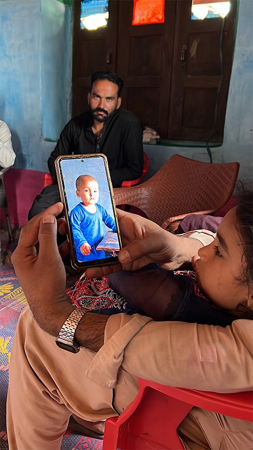 Wajid Kayani (right) shows a picture of his two-year-old daughter, Hadiya Wajid, on his mobile in Chafar village in the Poonch district of Pakistan-administered Azad Kashmir on May 23, 2025, who was killed by an Indian mortar shell on May 10. (AN photo)