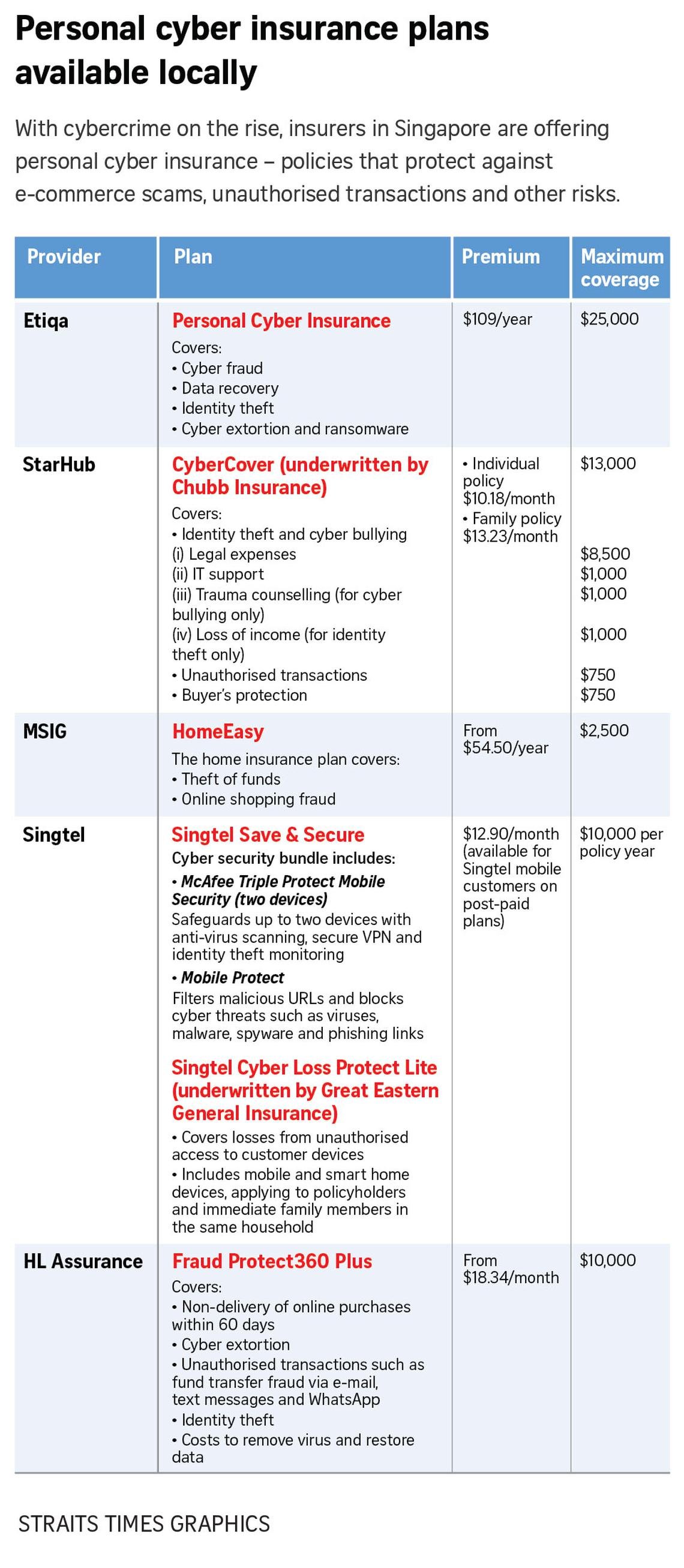 Personal cyber insurance, first rolled out by Etiqa as a standalone policy in 2018, is now offered by at least five insurers in Singapore, reimbursing cybercrime victims up to $25,000 annually for their financial losses.