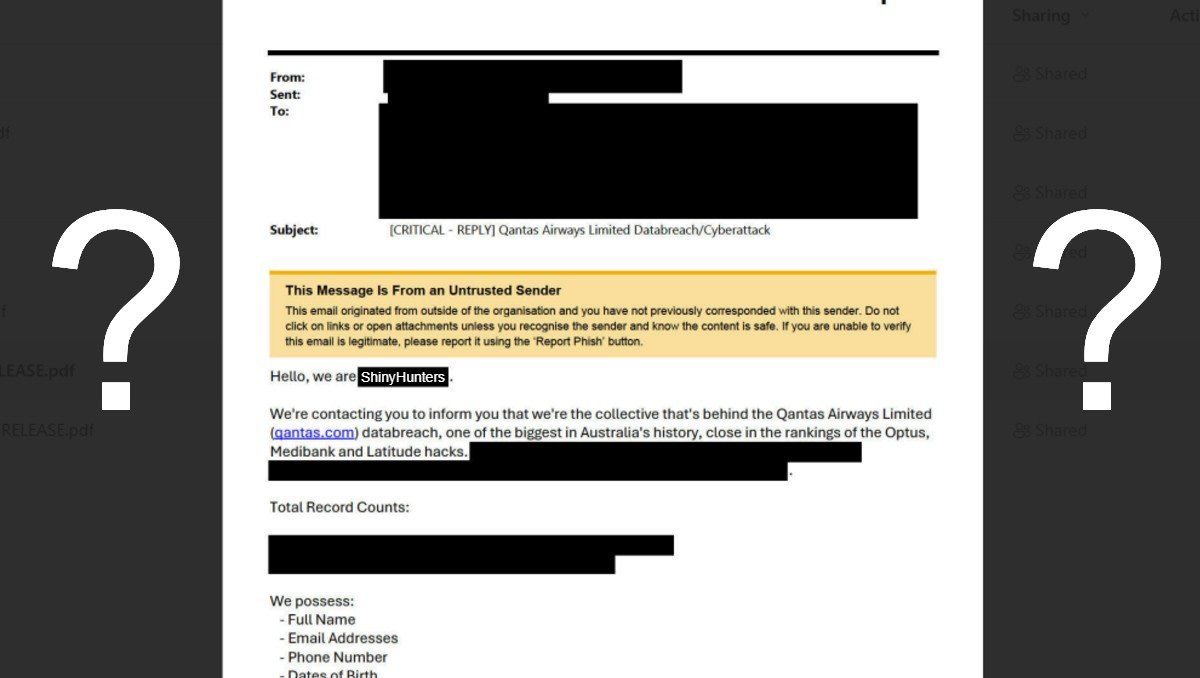 While correspondence between Qantas and its hackers has been released in court documents obtained by Cyber Daily, the name by which the hackers introduced themselves was redacted. However, Bleeping Computer has learned through its channels that the identity of the hackers was ShinyHunters, which seems to fit the length of the redacted copy within the correspondence that Cyber Daily has previously seen.