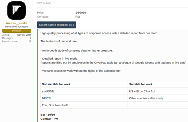 The Anubis operators use a different tactic to entice affiliates. This extortion scheme, which was first advertised on underground forums in late February 2025, offers three modes: