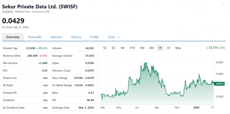As shown above, Sekur Private Data has a market cap of $12 million.