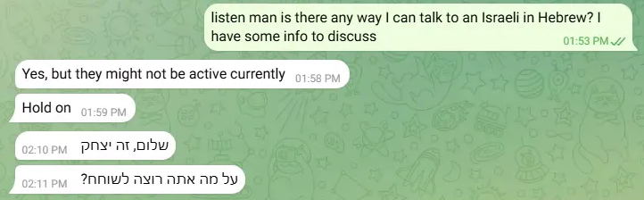 Although Sicarii group members present themselves as Israeli or Jewish, their use of Hebrew strongly suggests non-native language skills. Hebrew content on the group’s shame site contains misspellings, awkward phrasing, and literal translations of English idioms that do not exist in Hebrew. In private communications, the Telegram user claimed to personally handle only “frontend and communications,” while asserting other operators are Israeli and responsible for ransomware development and initial access operations. Using the same Telegram profile, the actor quickly reemerged as “Isaac” while producing Hebrew that appears to be machine-translated English and insisting they are Hebrew speakers even when challenged.