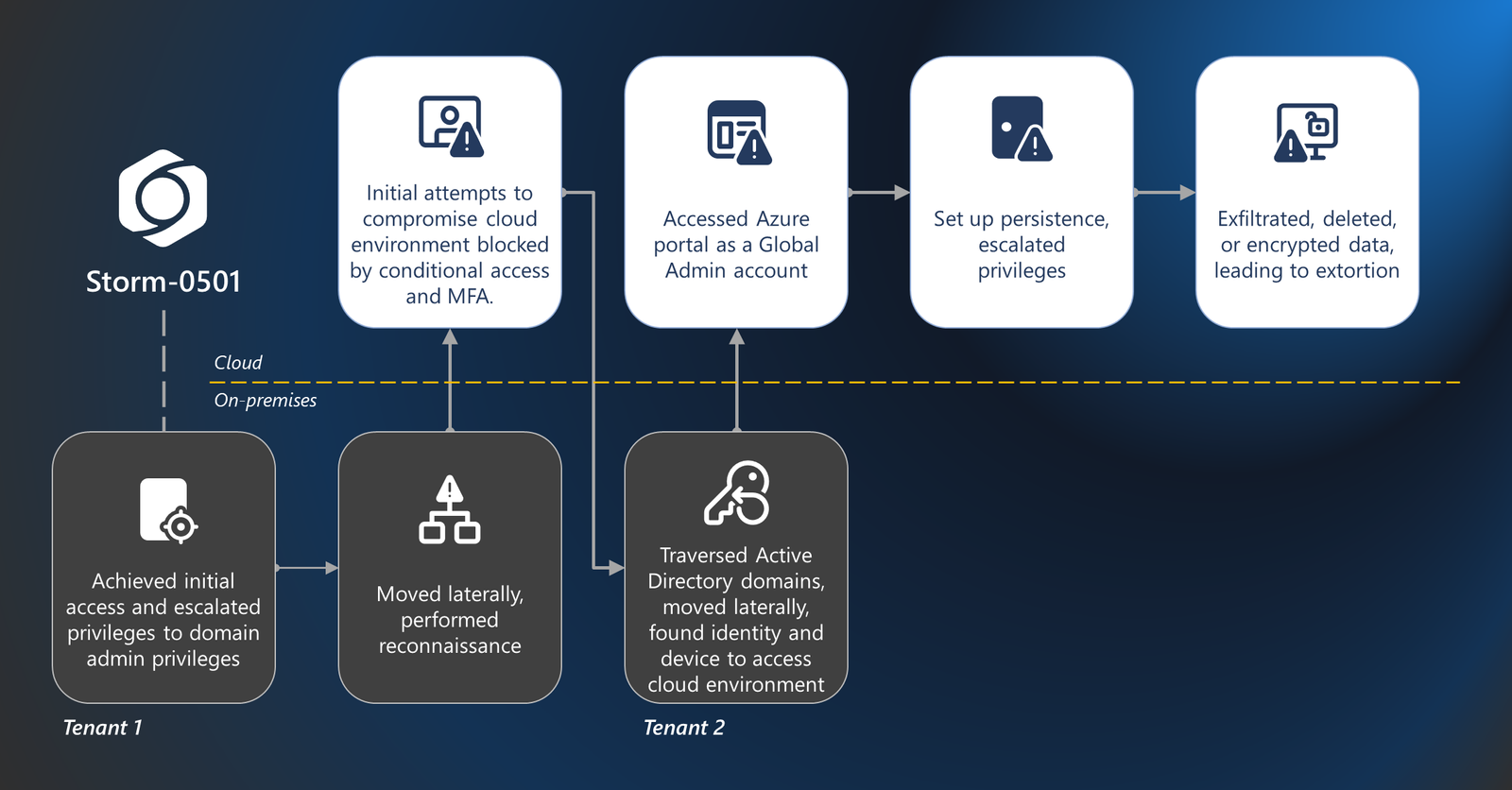 In this blog post, we describe the impact of a recent Storm-0501 attack on a compromised cloud environment. We trace how the threat actor achieved cloud-based ransomware impact through cloud privilege escalation, taking advantage of protection and visibility gaps across the compromised environment, and pivoting from on-premises to cloud pivots. Understanding how such attacks are conducted is critical in protecting cloud environments. Below we share protection and mitigation recommendations, including strengthening protections for cloud identities and cloud resources, and detection guidance across Microsoft security solutions to help organizations harden their networks against these attacks.