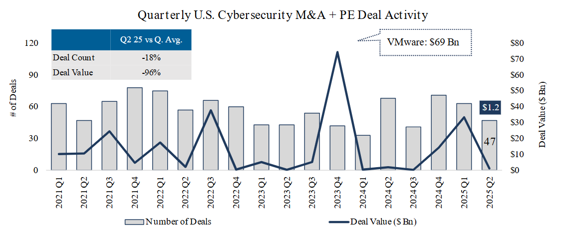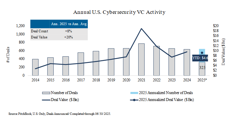 - M&A activity in the cybersecurity sector is on pace to exceed 2024 volume by 10% in 2025, with continued consolidation as larger firms acquire niche players to enhance capabilities or expand product offerings.