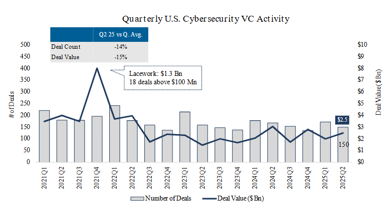 - Deal value: In Q2 2025, VC deal value increased compared to last quarter despite being slightly below the four-year quarterly average. The largest VC deal of Q2 was Cyera’s $540 Mn Series E funding round.
