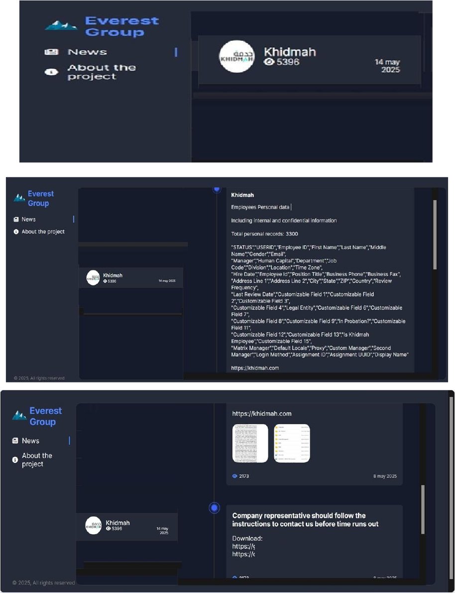 Recently, we observed that Everest Ransomware attacked and published the data of Khidmah (https[:]//www[.]Khidmah[.]com/) on its dark web website. Khidmah is a comprehensive real estate services company based in Abu Dhabi, United Arab Emirates. The company provides a wide range of solutions, including property management, leasing and sales, facilities management, home maintenance, cleaning, landscaping, and pool maintenance. With its customer-focused approach, Khidmah caters to residential, retail, and commercial properties. The data leak resulting from the ransomware attack includes employees’ personal information, along with internal and confidential data. A total of 3,300 personal records have been compromised. The exposed data consists of User ID, Employee ID, First Name, Last Name, Middle Name, Gender, Email Address, Manager, Human Capital details, Department, Job Code, Division, Location, Time Zone, and other sensitive and confidential information.