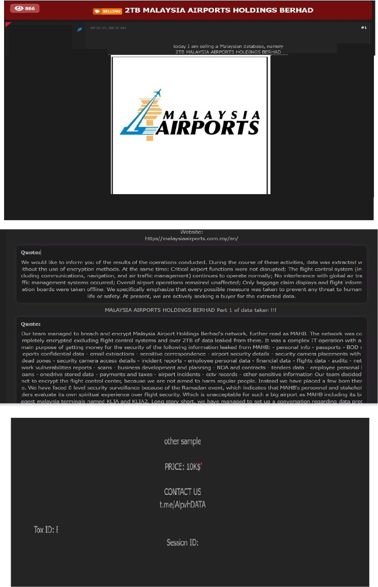 The CYFIRMA Research team observed a data sale related to MALAYSIA AIRPORTS HOLDINGS BERHAD (https[:]//www[.]malaysiaairports[.]com[.]my/) in an underground forum. Malaysia Airports Holdings Berhad (MAHB) is the primary operator of airports in Malaysia. MAHB oversees the management, operation, maintenance, and development of airports across the country and has expanded its operations internationally. The threat actor known as “Dedale” breached and encrypted the network of Malaysia Airports Holdings Berhad (MAHB), sparing only the flight control systems. Over 2TB of data was exfiltrated in what appears to have been a sophisticated cyberattack primarily aimed at extortion. The threat actor has demanded a ransom of $10,000 in exchange for the compromised data.