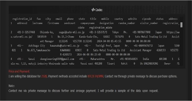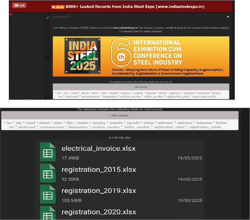 The CYFIRMA Research team observed a data sale related to India Steel Expo (https[:]//www[.]indiasteelexpo[.]in/) in an underground forum. The official website indiasteelexpo[.]in serves as the primary portal for India Steel 2025, the 6th International Exhibition and Conference on the steel industry. Jointly organized by the Ministry of Steel, Government of India, and the Federation of Indian Chambers of Commerce and Industry (FICCI), the event took place from April 24 to 26, 2025, at the Bombay Exhibition Centre (NESCO), Mumbai. The database contains a wealth of personal and professional information, making it a valuable asset for various purposes. The database being offered for sale contains the following fields for each record: Fax, City, Email, Phone, State, Title, Mobile Number, Country, Website, Zip Code, Status, Address, Last Name, First Name, Send Count, Company Name, Designation, Random Number, Visitor Number, Registration Date, along with other confidential information. The seller is asking $250 for the complete dataset.