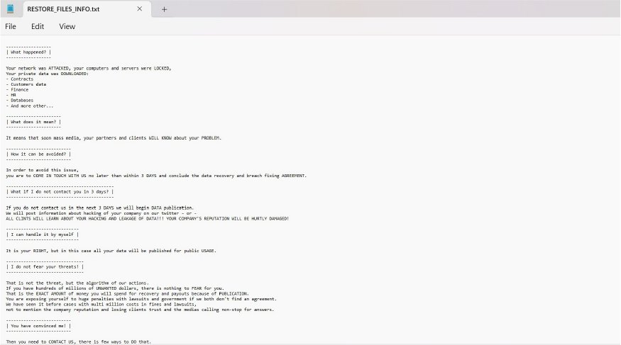 A ransom note is dropped, informing the victim that a range of sensitive data— including contracts, customer records, financial documents, HR files, and databases— has been exfiltrated.