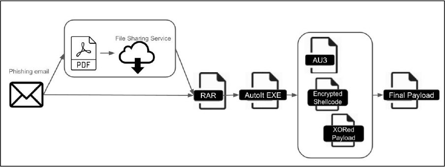 Researchers have observed multiple variations of attack chains used to deliver DarkCloud Stealer, all following a similar pattern. These attacks typically begin with a phishing email, which either contains a compressed file (RAR archive) or a PDF. In some cases, the PDF tricks the victim into downloading a fake software update from a file- sharing site. Once opened, the RAR archive includes a hidden executable file designed to run in several steps. This file uses scripting to unpack and activate the final payload— DarkCloud Stealer—while keeping its actions concealed. The layered approach helps the malware evade detection and increases its chances of success, posing a significant threat to its targets.