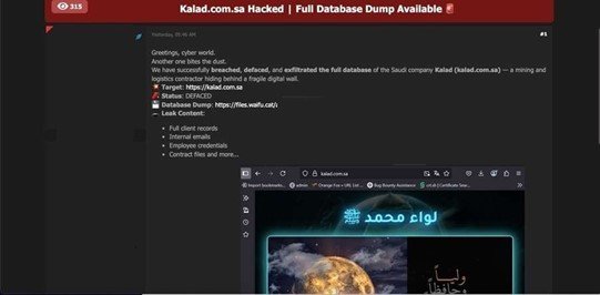 The CYFIRMA Research team observed a data leak related to Saudi Mining & Logistics Firm Kalad(https://kalad[.]com.sa/) in an underground forum. A threat actor has allegedly breached Kalad, a company described as a mining and logistics contractor in Saudi Arabia. In a post on a cybercrime forum, the hacker claimed to have not only exfiltrated the company’s entire database but also defaced its official website, kalad[.]com[.]sa. The post included a screenshot of the defaced homepage as proof of the intrusion.