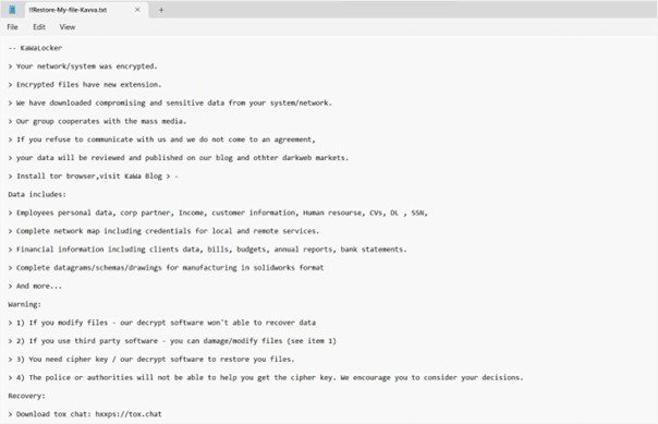 The appearance of KaWaLocker’s ransom note (““!!Restore-My-file-Kavva.txt “) (Source: Surface Web)