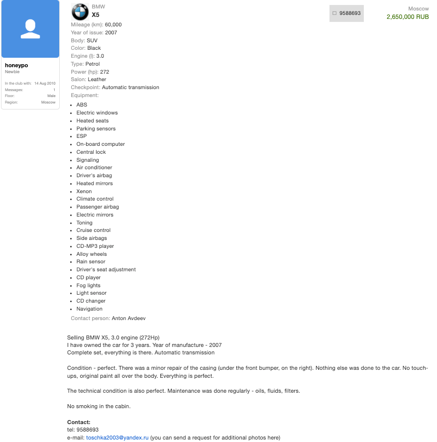 Searching the web for Toha’s email address toschka2003@yandex.ru reveals a 2010 sales thread on the forum bmwclub.ru where a user named Honeypo was selling a 2007 BMW X5. The ad listed the contact person as Anton Avdeev and gave the contact phone number 9588693.